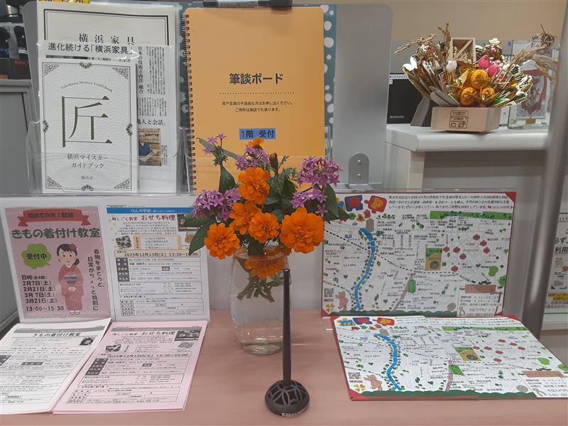 1階受付カウンターの隅にちょこんと置いてありますので、御覧になってみてください。11月20日に「畳師に教えてもらう「い草」のお飾りリース」という講座を初開講し、
