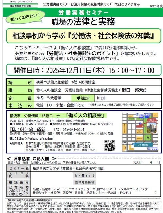 公開日 2025年10月16日 「働く人の相談室」主催の労働実務セミナーは、 こちらのリンクからお申し込みください。 https://gibun.jp/seminar/ 日時:2025年12月11日 (木) 15時~17時 会場:横浜市技能文化会館・6階 603研修室